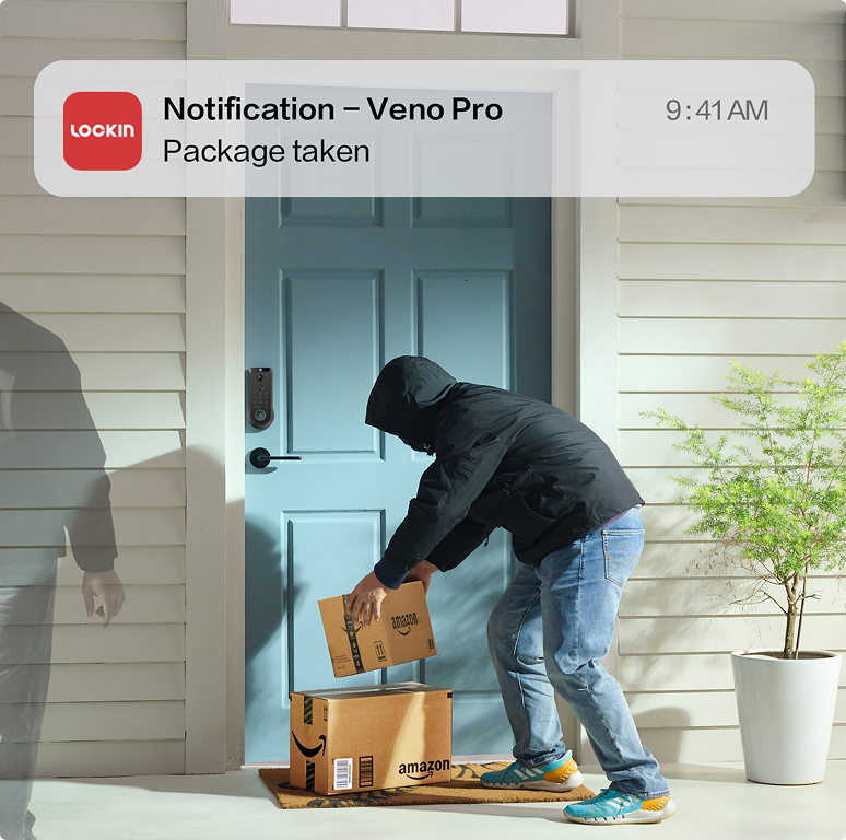 LockinCam™ offers 2K night vision and AI human detection, alerting you the moment someone lingers outside. Speak to strangers remotely using the Lockin app.