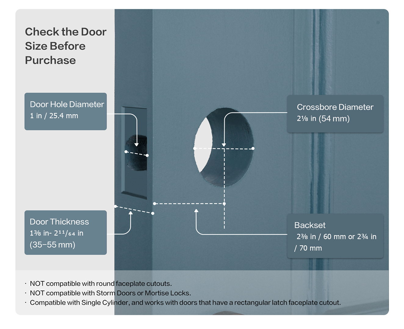 - Deadbolt Latch Box Depth: ≥25.4mm (1 in)